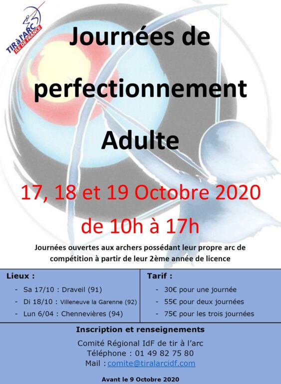 Le Comité Régional propose de nouveau des journées de perfectionnement à destination des adultes à partir de leur 2ème année de licence. Ces journées s'adressent aux archers séniors 1, 2 & 3 partiquant les disciplines de cibles anglaises en arc classique, arc à poulies ou arc nu et utilisant un arc de compétition (hors arc d'initiation). Elles seront encadrées par 2 entraîneurs professionnels membres de l'Equipe Technique Régionale. Elles sont organisées dans 3 salles différentes réparties sur l'ensemble de la région. Le tarif d'une journée est de 30€, dégressif pour les archers qui voudraient participer à plusieurs journées. Le nombre de places est limité à 12 personnes par journée. Chacun vient avec son panier repas pour la pause déjeuner sur place. Bulletin d'inscription à renvoyer au secrétariat du CRIdF accompagné du règlement avant le 9 Octobre 2020. |
