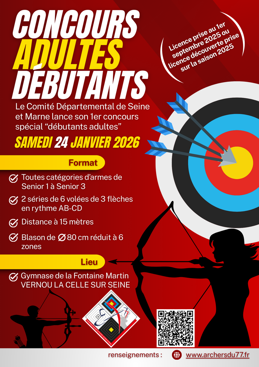 Cette année, les Archers des 7 Moulins vous accueilleront à Vernou la Celle sur Seine le SAMEDI 24 JANVIER 2026 à 8h30 pour un concours pensé spécialement pour les débutants adultes de 1ère année.